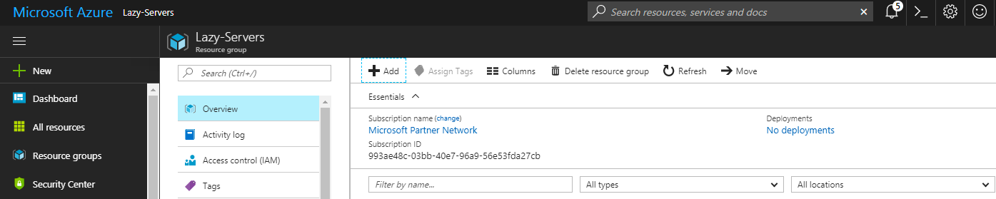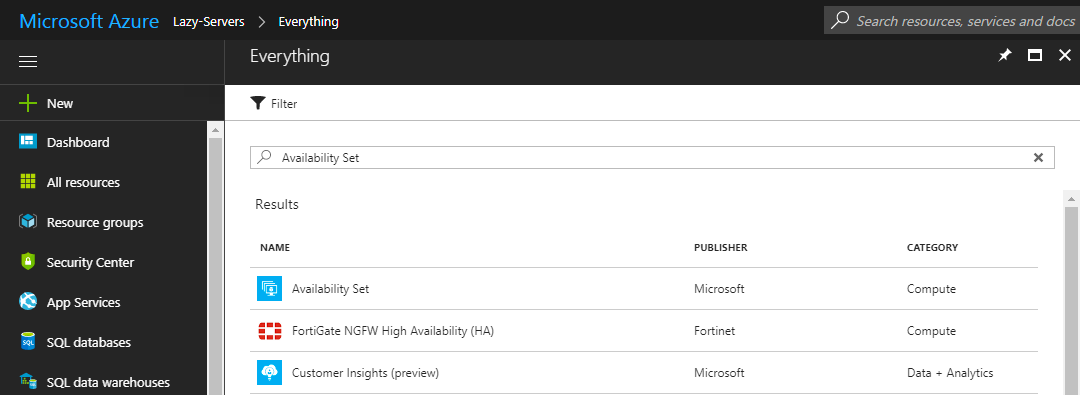 I have selected a pre-configured Resource Group called Lazy-Servers. Click on Add in the properties of the Resource Group and type Availability Set and Select the Microsoft Availably Set.