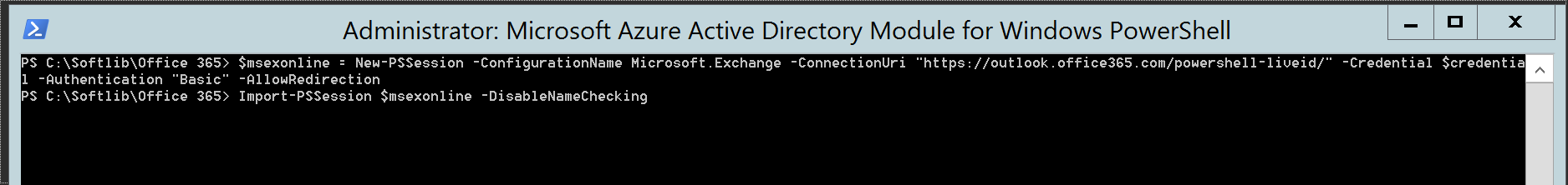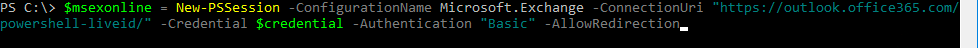 $msexonline = New-PSSession -ConfigurationName Microsoft.Exchange -ConnectionUri "https://outlook.office365.com/powershell-liveid/" -Credential $credential -Authentication "Basic" -AllowRedirection