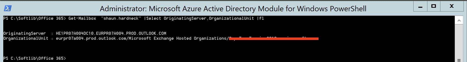 Get-Mailbox "shaun.hardneck" |Select OriginatingServer,OrganizationalUnit |fl