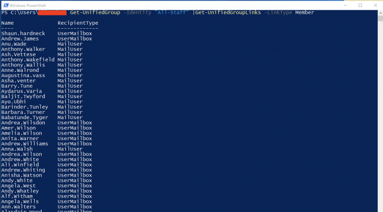 This cmdlet provides you with the members of the Office 365 Groups “All-Staff“.