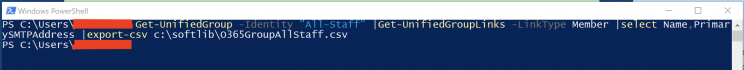 Get-UnifiedGroup -Identity "All-Staff" |Get-UnifiedGroupLinks -LinkType Member |select Name,PrimarySMTPAddress |export-csv c:\softlib\O365GroupAllStaff.csv