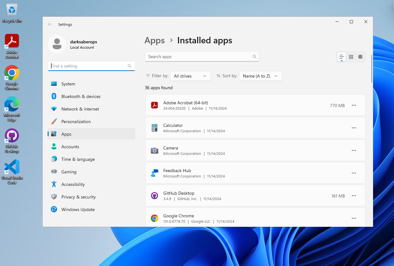 - Add any software your users will need. This might include productivity tools, security software, or specialized applications for your organization. For this example I have installed the following apps, Adobe Reader, Google Chrome, GitHub Desktop, Visual Studio Code.