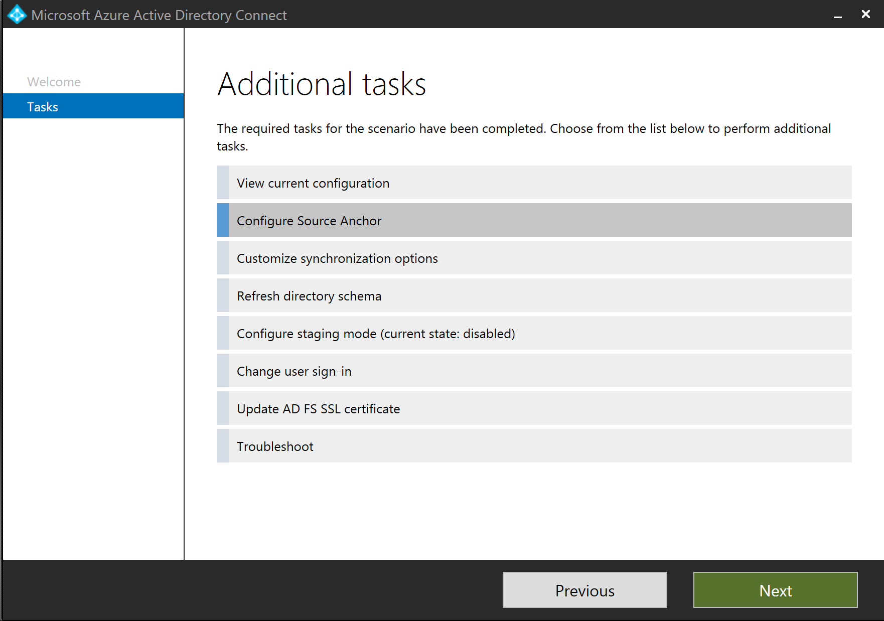 - First, the Azure AD Connect wizard queries your Azure AD tenant to retrieve the AD attribute used as the sourceAnchor attribute in the previous Azure AD Connect installation (if any). If this information is available, Azure AD Connect uses the same AD attribute.