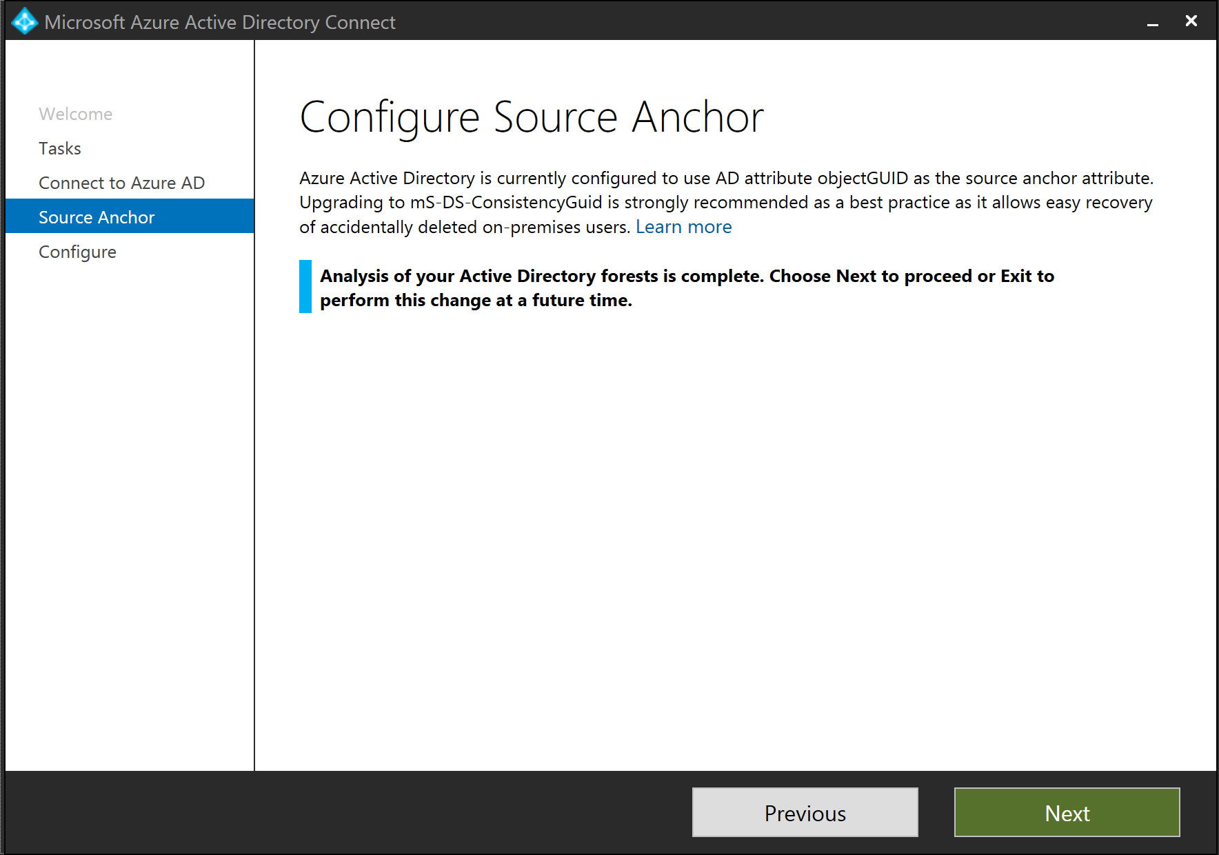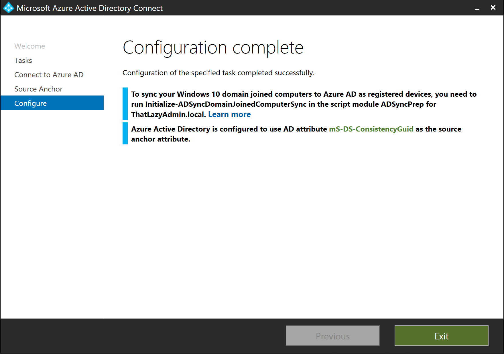 From the message on the completed screen, we can see that Azure AD is now configured to use AD attribute mS-DS-ConsistencyGuid as the source anchor attribute.