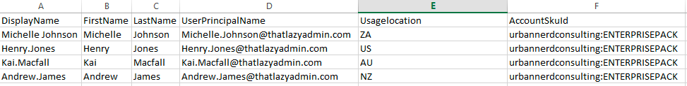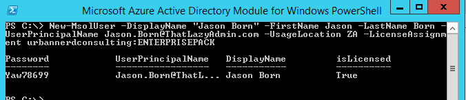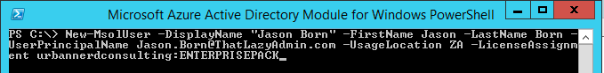 New-MsolUser -DisplayName "Jason Born" -FirstName Jason -LastName Born -UserPrincipalName Jason.Born@ThatLazyAdmin.com -UsageLocation ZA -LicenseAssignment urbannerdconsulting:ENTERPRISEPACK