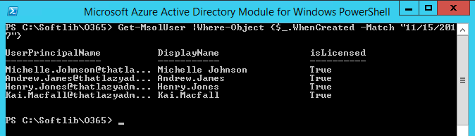 Get-MsolUser |Where-Object {$_.WhenCreated –Match “11/15/2017”}
