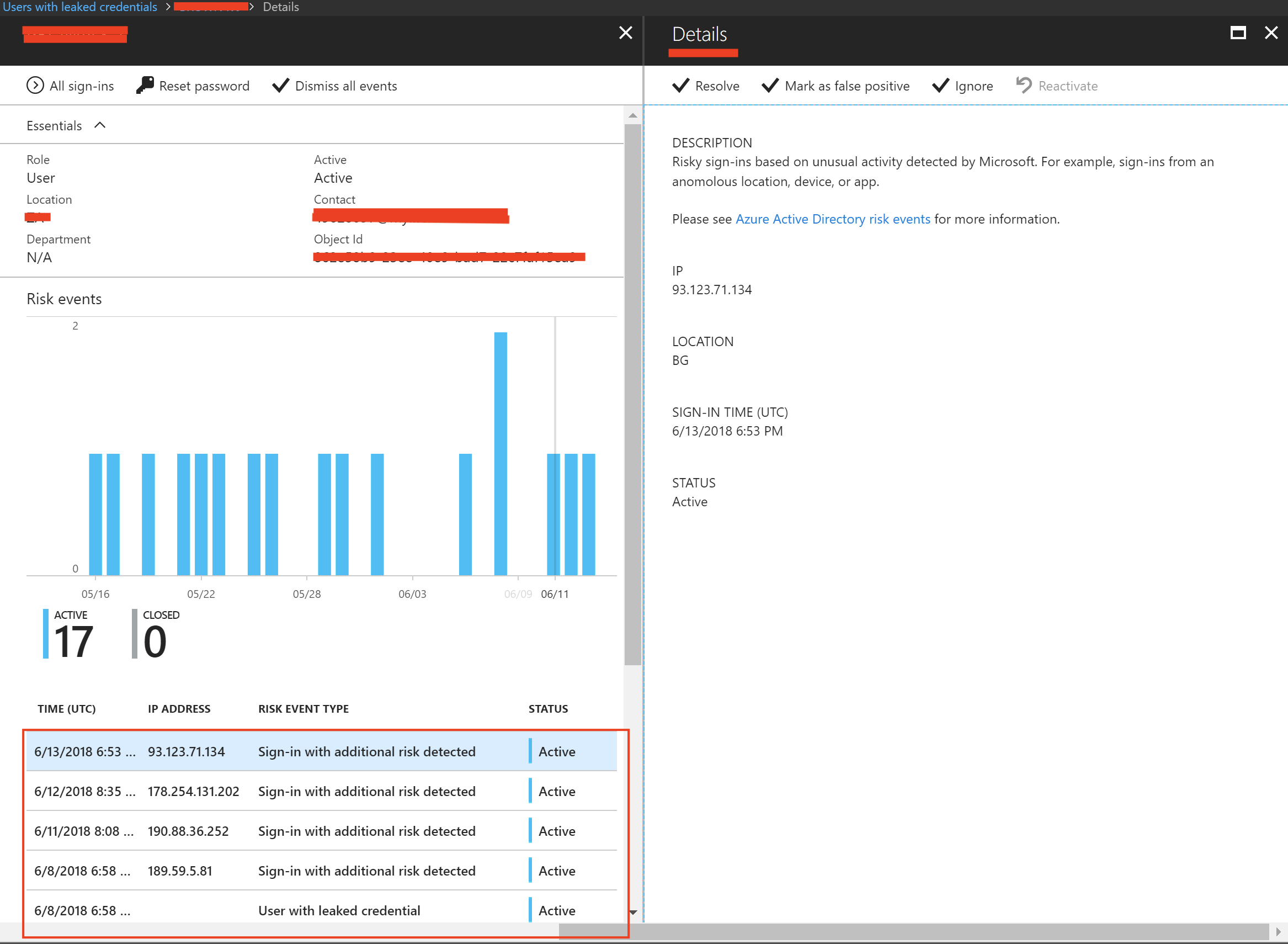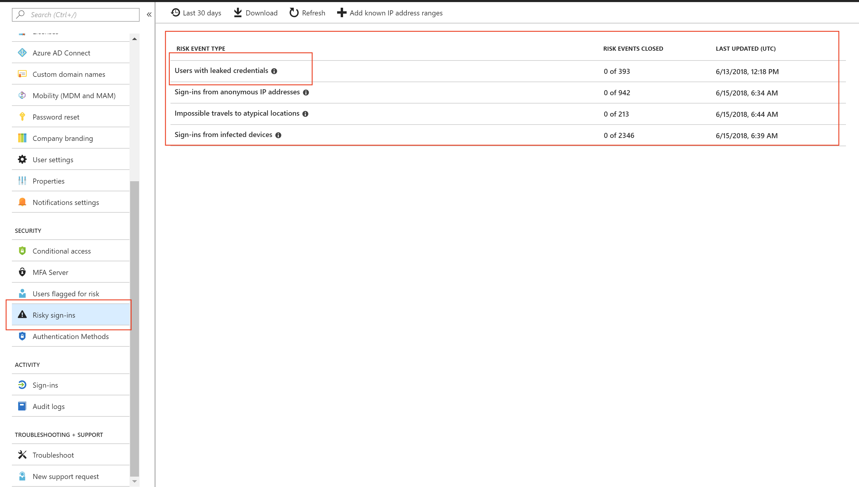 - Risky sign-ins – A risky sign-in is an indicator for a sign-in attempt that might have been performed by someone who is not the legitimate owner of a user account. For more details, see Risky sign-ins.